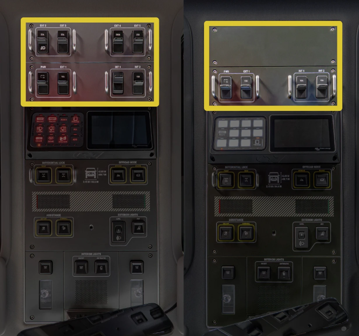 Some models were delivered with a factory auxiliary battery, others with a fuse block, high load auxiliary switches, NATO plug, or OE inverter. The installation of the Agile Offroad system replaces the OE auxiliary battery or amp and speaker system where equipped. Depending on your build, you may need specific add-ons to preserve full factory functionality.