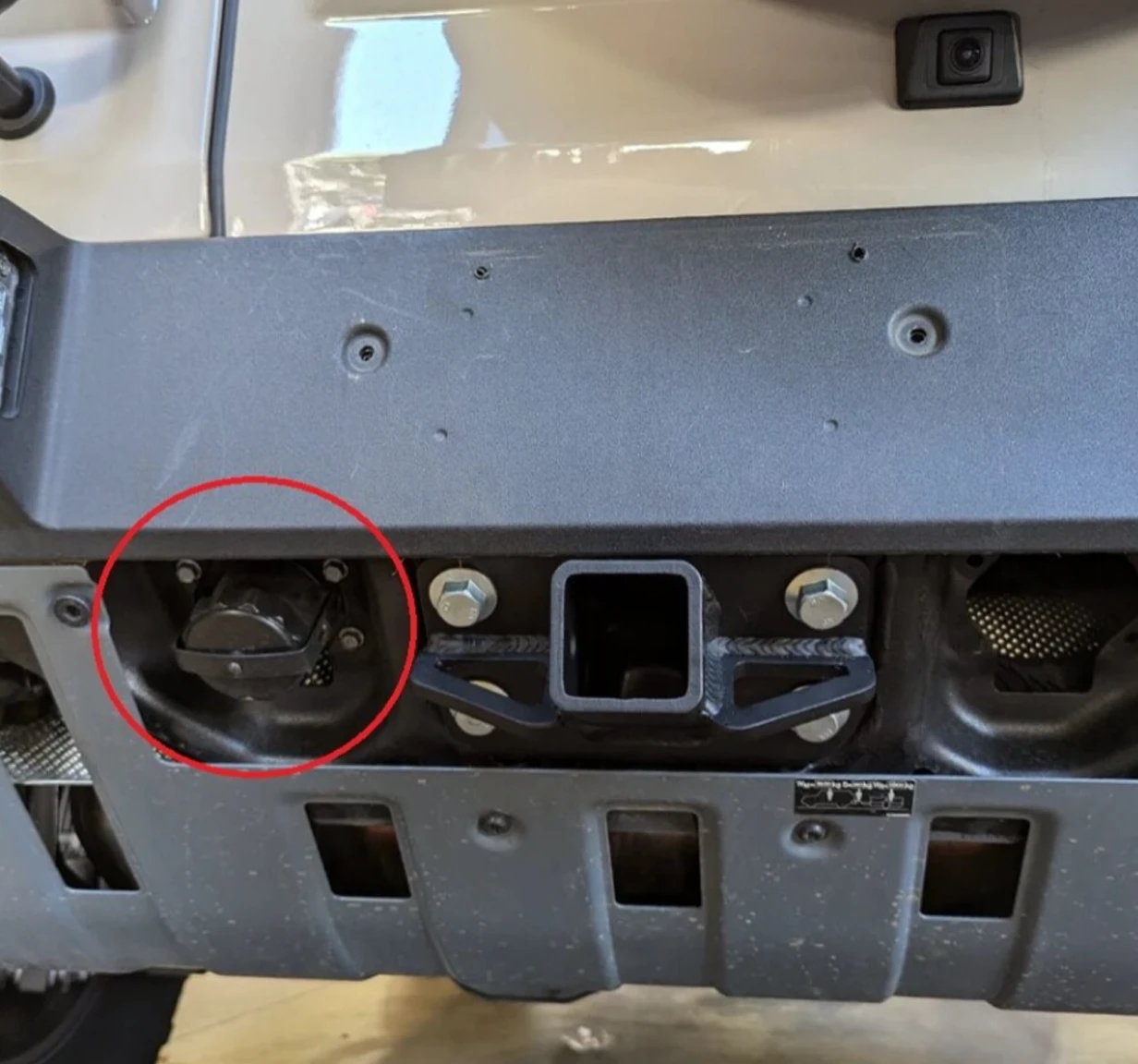 Look next to the rear hitch receiver. Most vehicles will have a plastic cover panel in this area. Remove the plastic cover to check for the presence of the NATO plug behind it.