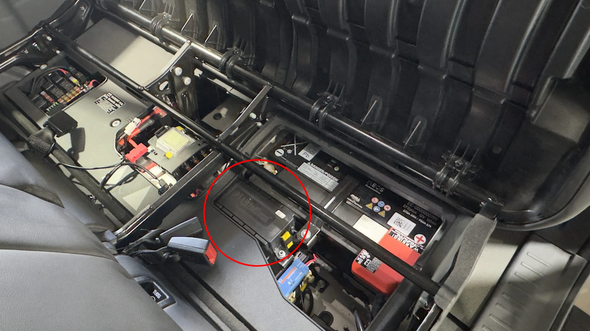 Look under the rear seat on the passenger side. If your vehicle has a second battery from the factory, it should also have a factory fuse block in this location.