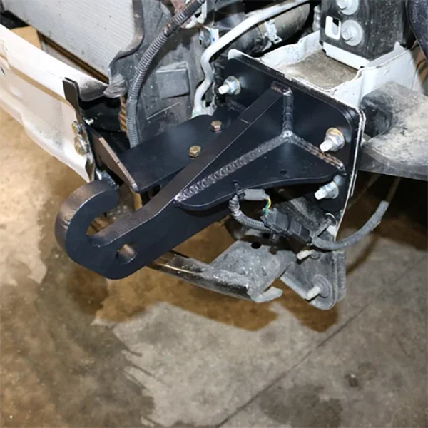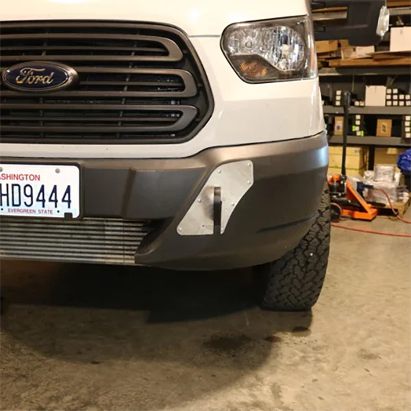 This frame-mounted front tow hook is designed to add a safe and reliable recovery point to Ford Transit vans that do not include a factory front tow point. It mounts through the front bumper cover and includes a finished aluminum cover plate for a clean, integrated appearance.
