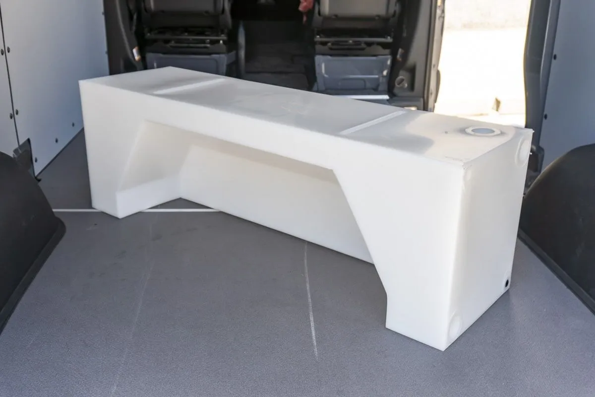 Utilize the wasted space around the rear wheel wells! Add potable water storage to the interior of your rig with a universal 24-gallon water holding tank. This tank is designed to fit Sprinter 2500 & Transit (single rear wheel) vans, snugly fitting against the wall and around the wheel tubs. However, this solution can easily be adapted to fit dual-rear wheel Sprinter 3500s, Transits, and other vans (by leaving space between the tank & the vehicle’s interior wall). This tank fits on either side of the vehicle and accepts 1/2″ (black plugs) and 1-1/2″ (need to be drilled) NPT fittings. The tank measures 48″ long x 16″ tall x 14″ wide and are made from BPA Free Food Grade Plastic.
