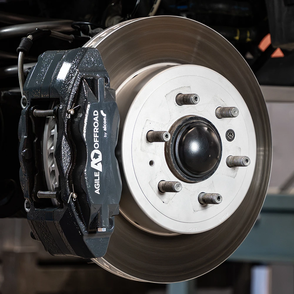 Developed by Alcon and engineered for the INEOS Grenadier, this front brake kit is built to withstand the demands of heavy off-road use while improving on-road safety and control. The upgrade replaces the factory 12-5/8″ rotor and 2-piston cast iron caliper with a massive 13.5″ diameter rotor and robust 4-piston cast iron caliper. A billet steel, zinc-plated caliper bracket ensures precise mounting and long-term strength. The kit also includes corrosion-treated rotors with directional cooling vanes for better heat management and a set of braided steel brake lines to complete installation. Designed to clear factory wheels as well as Agile’s Overland HD and XT wheels, this system offers uncompromising performance without sacrificing fitment.