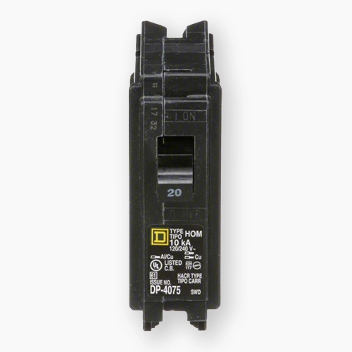 Standard 20 amp single pole circuit breaker designed for 120 V AC panel installations. Suitable for basic circuit protection in residential or equipment power distribution applications.