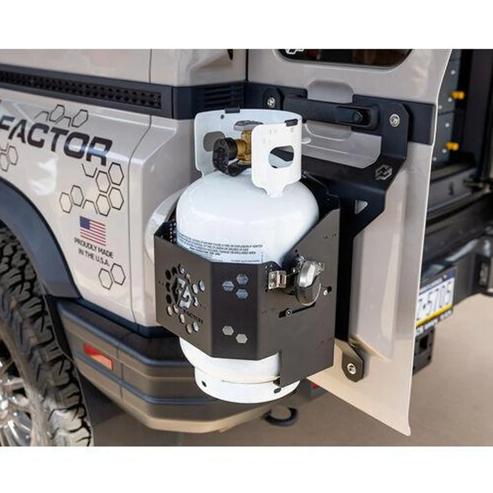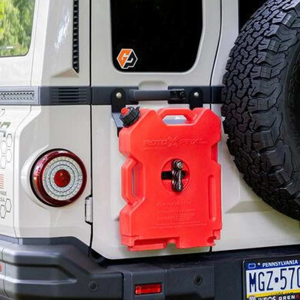 The GP Factor Rear Door Accessory Mount for the Ineos Grenadier provides a rugged, low-profile solution for mounting Rotopax, propane tanks, and other accessories without extending past the spare tire. Easy to install with no modifications required.