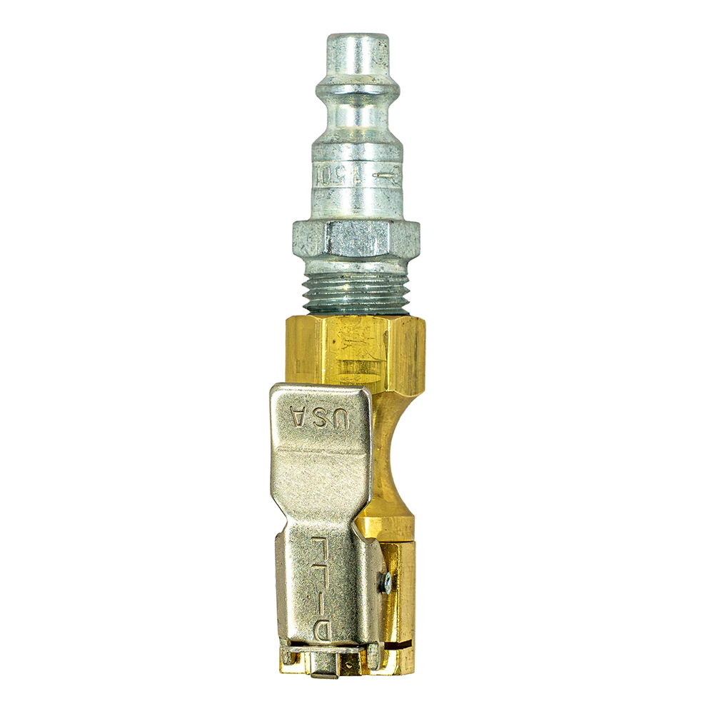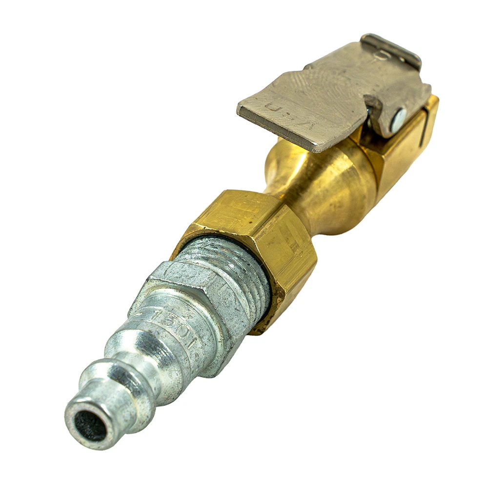 This industrial clip-on chuck adapter is designed for fast, hands-free tire inflation and deflation. It provides a secure fit with quick release functionality, making it ideal for efficient use in the shop or on the trail.