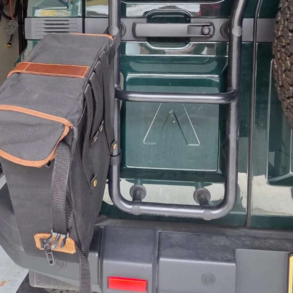 The Overland Outfitters Ladder Bag for the INEOS Grenadier adds smart, weather-resistant storage directly to your vehicle’s ladder. Built from heavy-duty canvas and leather, it secures with adjustable straps and swings away for easy ladder access when needed.