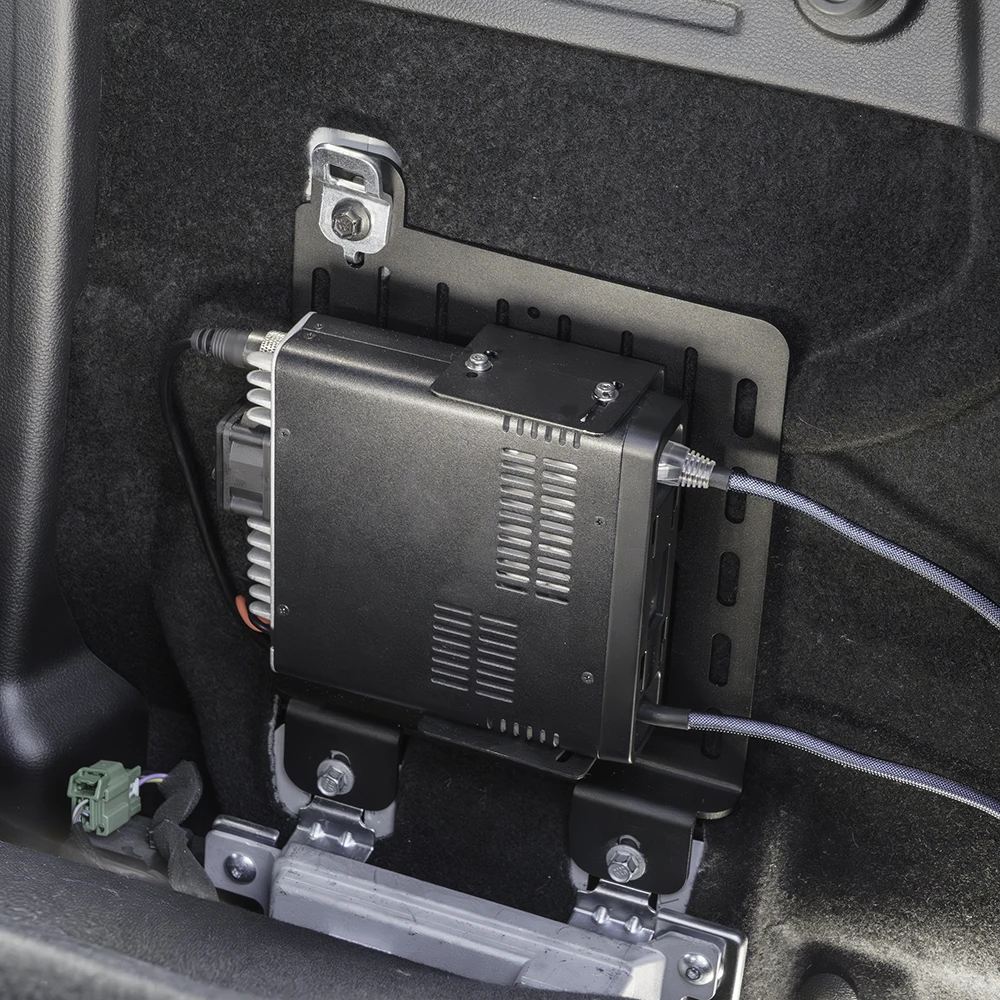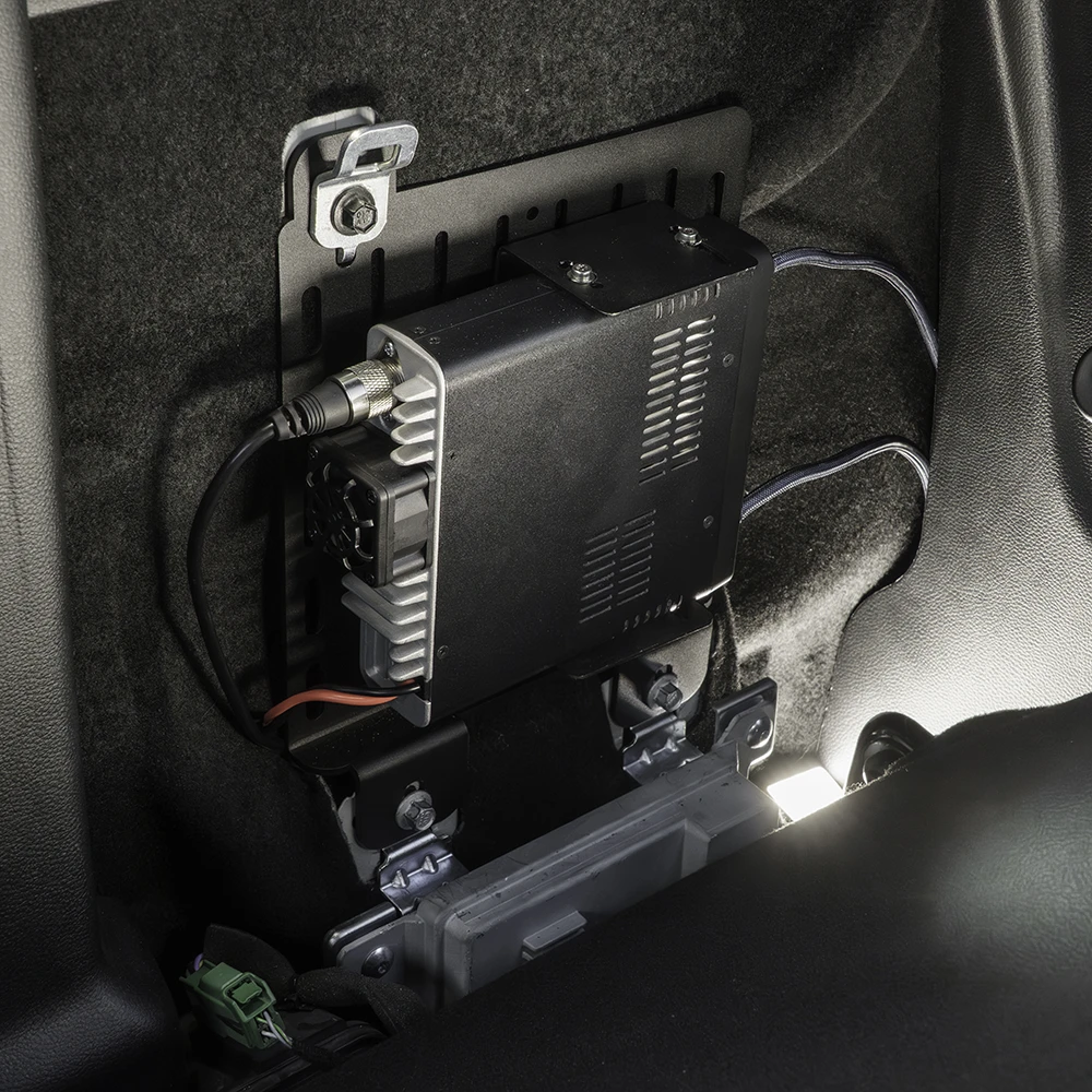 - Installs behind the rear seat using factory mounting points